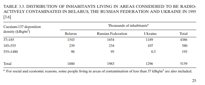 これも今中助教の報告だが、移住政策が始まる前、事故後4年が経過した1990年のそれぞれの汚染区分における人口が書かれている。55万ベクレル以上というのは「表2:汚染地域の住民数」に対応するが、ベクレルではなくキュリーという単位で書かれている。この場合1キュリーは37Gベクレルであり、1Ci/km2=37kBq/m2という事になるから15~40キュリーの地域が55万~148万ベクレル平米の地域に対応する。そこには23万人の住民が居住と記されている。