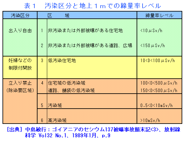 また、ウラジミール、今中報告には旧ソ連が出した緊急措置的な被曝限度が書かれているが、それは「事故の1年目10レム、1987年5レム,1988年3レム、1989年3レム、1990年0.5レム:うち外部被曝と内部被曝が50%ずつ」というものである。1レムは1レントゲン(10mSv)であるから、1年目は100mSv、2年目は50mSv、3~4年目は30mSv、そして5年目に5mSvということで、事故発生年に5mSvという訳ではない。