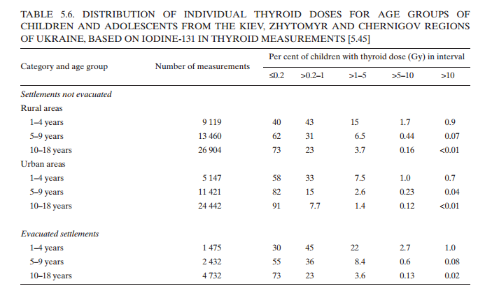 以下、IAEAのチェルノブイリ・レポート(ENVIRONMENTAL CONSEQUENCES OF THE CHERNOBYL ACCIDENT AND THEIR REMEDIATION: TWENTY YEARS OF EXPERIENCE Report of the Chernobyl Forum Expert Group ‘Environment’)113ページに子供達が甲状腺に受けた等価線量の表が掲載されている