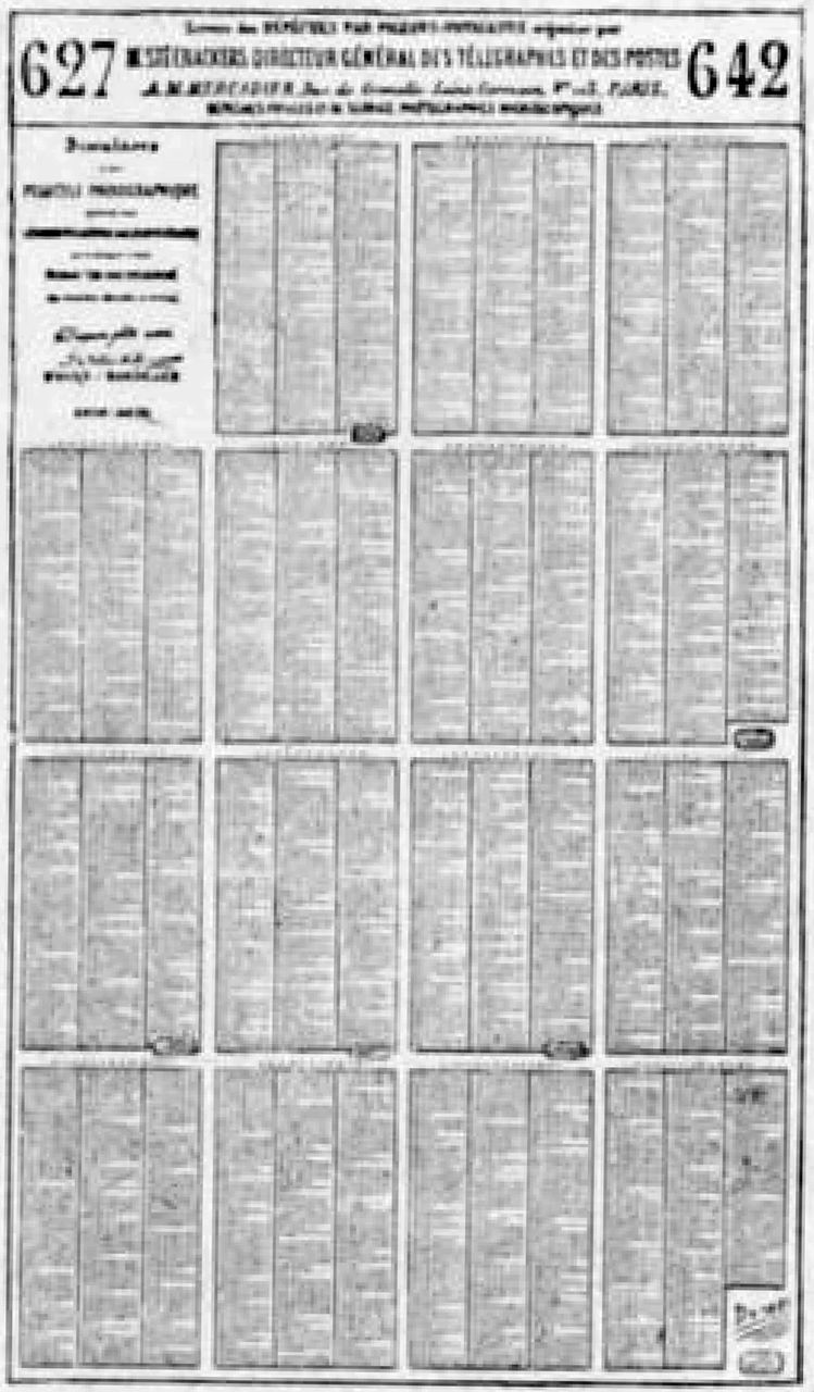 電報は、活字を並べたパネルをコロジオンのフィルムに焼き付けて作成された。筆者(西田)はパリの北サン=ドニ県にあるアルゼメチエ博物館の資料館で実物を閲覧した。出来上がりの寸法は縦6cm横4cm弱。コロジオンのフィルムは光に弱いため、写真撮影の許可は下りなかった(ちなみに、館内を案内してくれた重要財産保存担当のコルシー氏によれば、仕組みがあまりにも細密なので未だ修復保存技術も確立されていないとのことだ)。