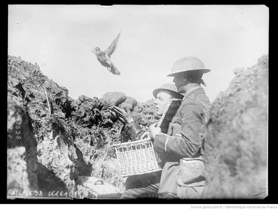 上図:第1次世界大戦中、前線より放たれる伝書鳩。