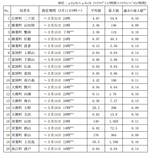 ◆ 前町長や病院スタッフが主張するように、吹き飛んだ建屋の断熱材などが降ってきたかどうかはともかく、2011年3月分の県内モニタリングポスト値を見ると、3月14日までで記録が途切れている新山(No.18)、同じく北西方面に位置する上羽鳥(No.19)では最高値904、1590μSv/hというケタ違いに高い数値をそれぞれ計測している。