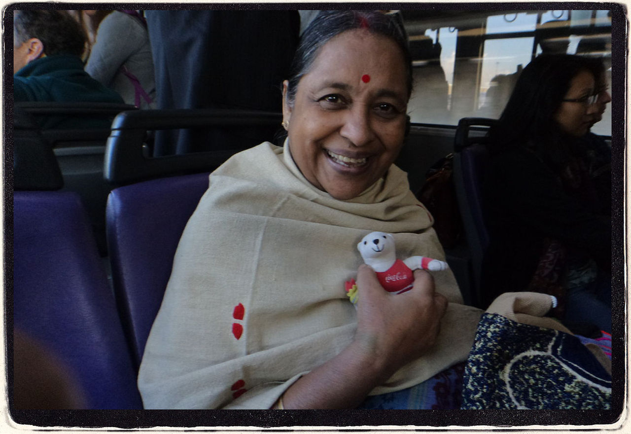 乗客は多くなさそうだ。搭乗ゲートから連絡バスに乗り、機体へと向かう。バスの中で美しいサリーをまとったアッサム女性と知り合った。この日はガイドや運転手など初対面の人と会う予定だったので、私も明るく快活な印象を与えるような服装を選んでいたが、ただ自宅に帰るだけのこの女性の衣装の華やかさには到底かなわない。やさしい微笑のこの女性は、バンコクに住む息子夫婦を訪ねた帰りなのだという。すてきな人と知り合った。幸先がいい。