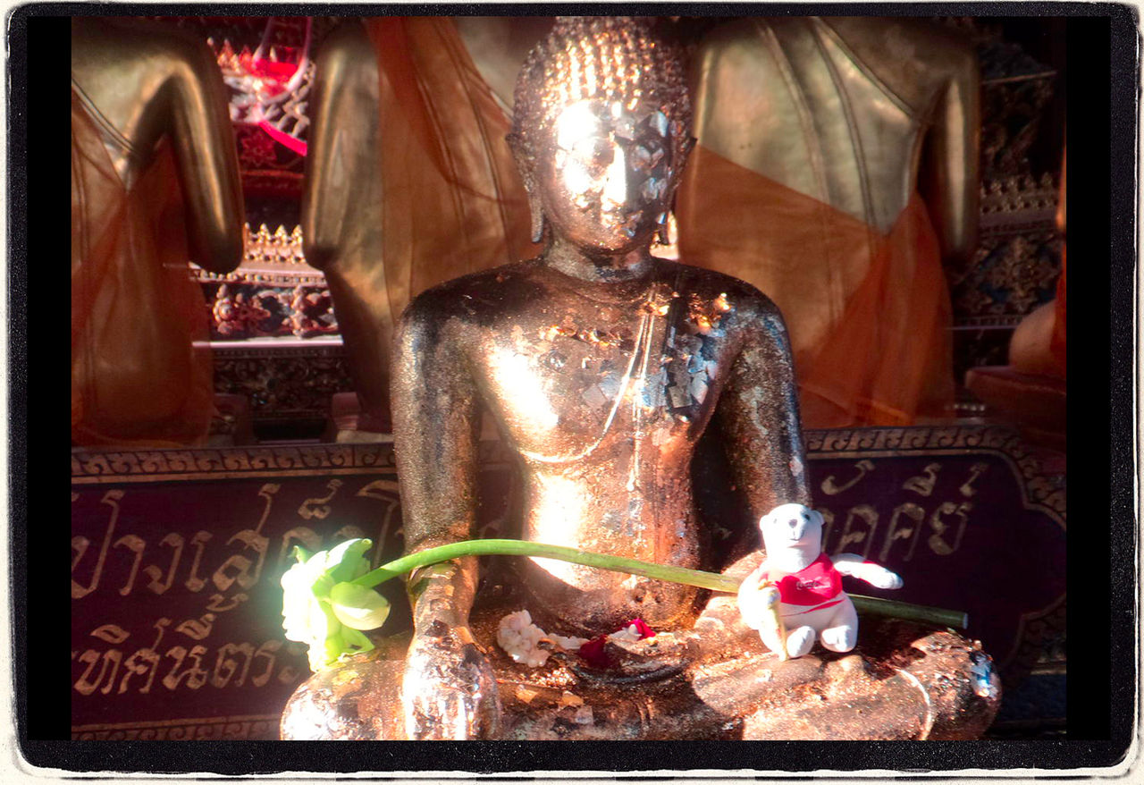 涅槃仏だけ見て帰ってしまう人も多いのか、これ以外のお堂にお参りしている人はあまりいなかった。まだ時間があったので、そういった小さなお堂のひとつで、お線香をあげ、ハスの花のつぼみを供えた。西日が当たる中、外気にさらされた小さな仏像の金箔はほろほろと剥がれ落ちそうだった。美術品なら、空調のあるガラスケースの中、あまり外光へ当てないように注意深く展示・保存するのだろう。でもこれは仏像だから、人がお参りに来る場所に安置されていなければお話にならない。剥がれかかった金箔の輝きが、まるで慈悲の印のように思えた。像の前で座り、瞑目する。意識が瞬時に深い集中の状態になるのがわかった。