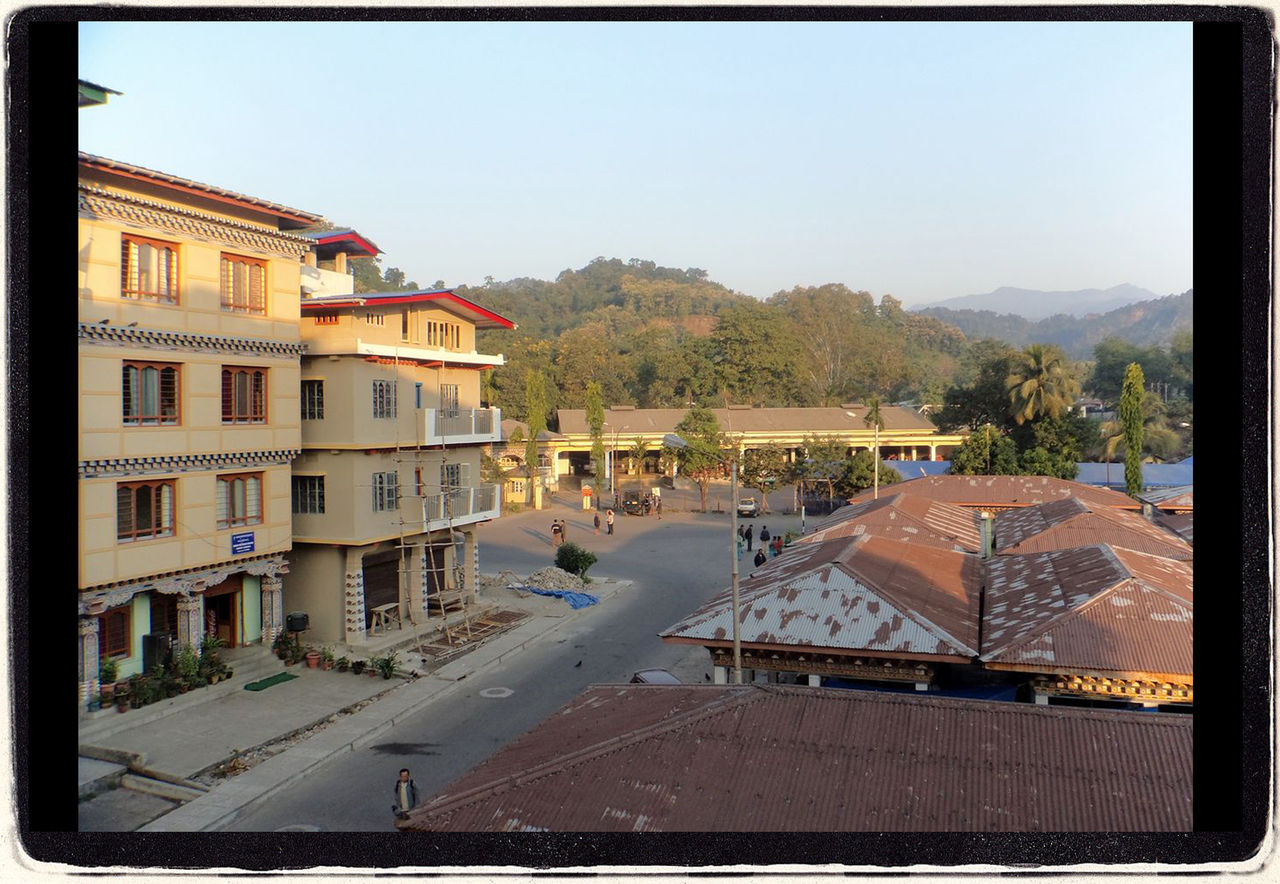 チェックインをすませると、ホテルの男性が部屋まで荷物を運んでくれた。渡された部屋の鍵は、鍵というより正確には鍵と錠前だった。部屋にはベッドとイス、クローゼット、それに小さなテーブルがふたつ。建物の3階の角にある部屋から、すぐ隣の市場がよく見える。そしてその背後には、ラヒムが「ブータンだよ」と言っていた山が連なっている。