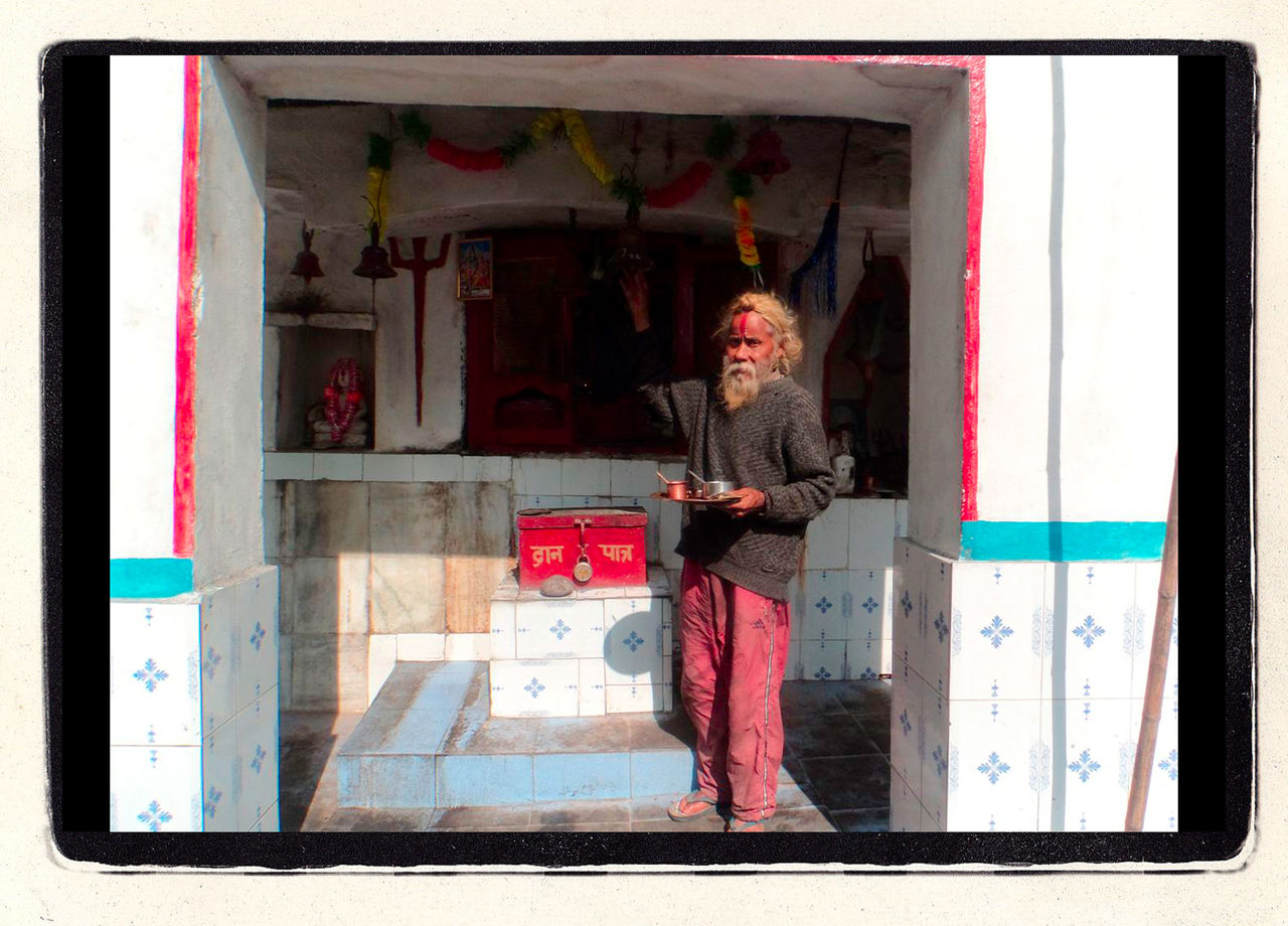 ネテンが車を停め、堂守の老人に紙幣を渡す。老人は水差しにいれた水をネテンの手のひらに注いだ。聖水なのだろう。そして、手に持った細い棒の先端を彼の額に押し付けた。ネテンの額に、紅い点がついていた。ジャムソーに言われて私も手を差し、同じように聖水をもらい、額に紅い点をつけてもらった。堂守が祠の鐘を鳴らした。"旅が安全でありますように"と。