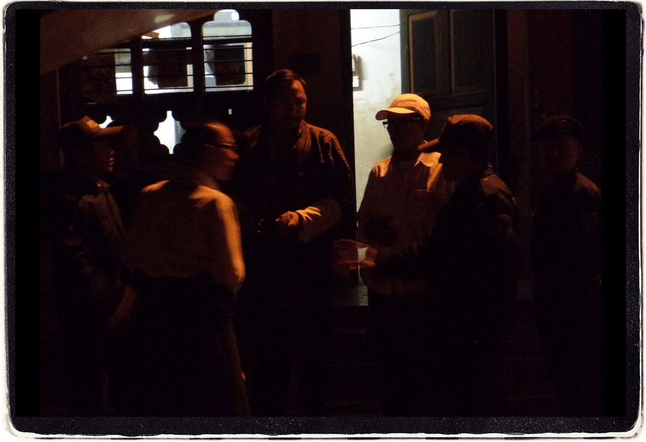 表に出てきたその警官と、さらに別の警官、役所の人たち、ジャムソーにネテンが暗闇の中でああだこうだと言い合っている。声を荒げることはないが、相当もめているのがわかる。しまいには警官が車のナンバープレートを控えに来た。大丈夫なんだろうか?こんなこと、早くやめてもらいたい。私は車の外に出た。