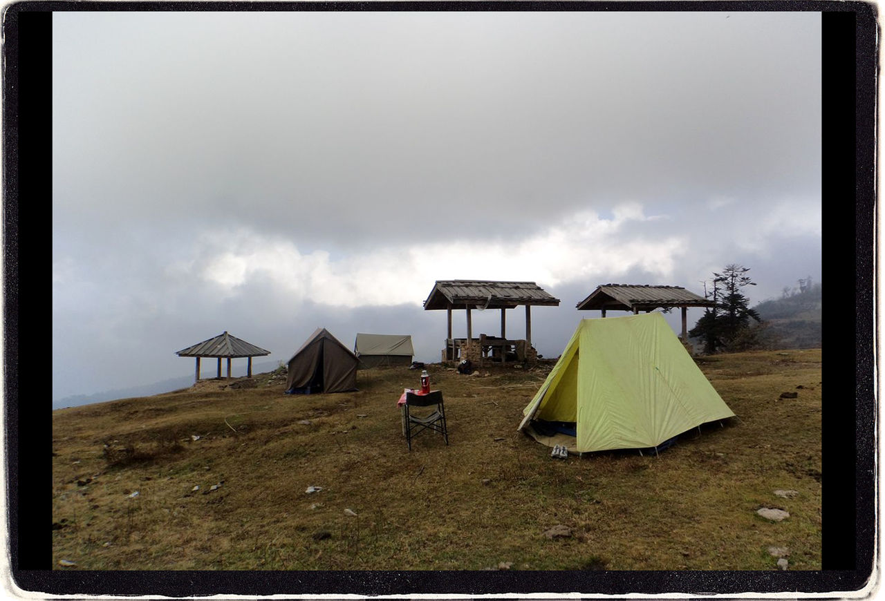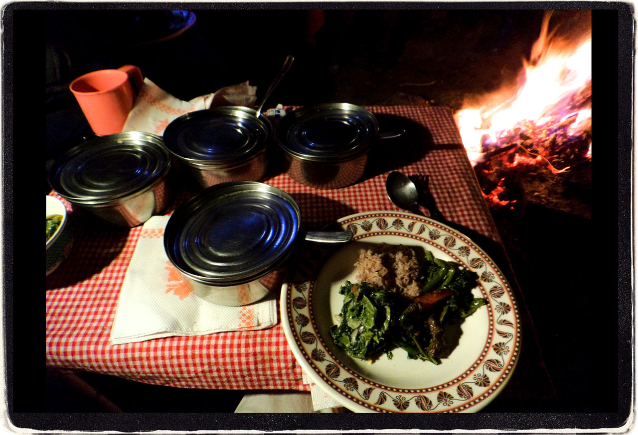 ドルジは小さなソーラーパネルのついたキャンプ用の蛍光灯を持っていた。トレイルを歩くあいだパネルをバックパックに取り付けて発電・充電しておけば、暗いながらもキャンプ地の常夜灯として使うことができた。寒いので、みんなキャンプファイアの周りに集まった。ファイアピットを覆う東屋の柱に、ドルジが蛍光灯を取り付ける。食事ができる程度には明るくなる。