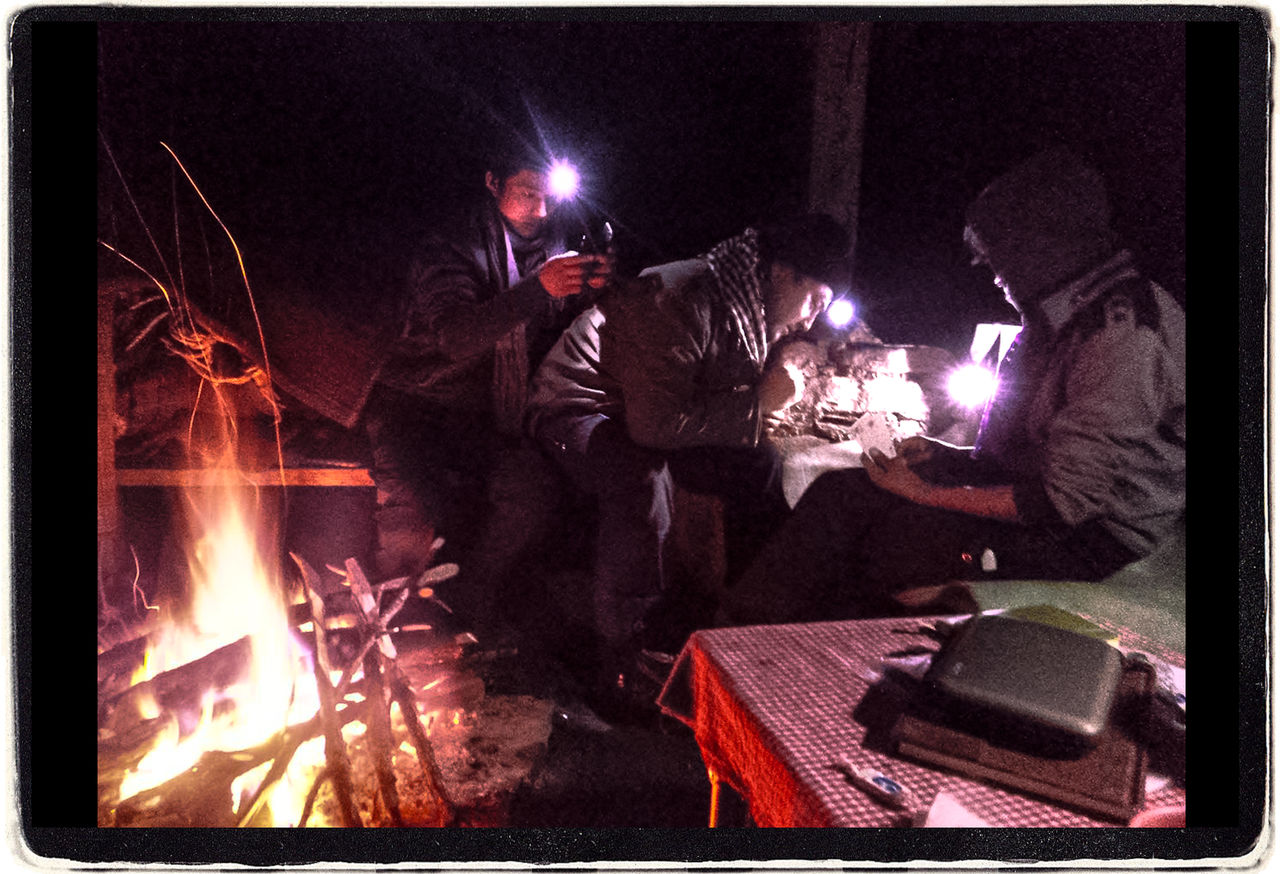 キャンプファイアの近くは暖かい。私は蛍光灯の光で日記やポストカードを書きながら、彼らの団らんを横目で見物した。もうだいぶ遅くなったが、みんないっこうに寝る様子がない。ロブザンだけが、キャンプファイアの横にブランケットを広げ始めた。ロブザンはテントで寝ないのだろうか?