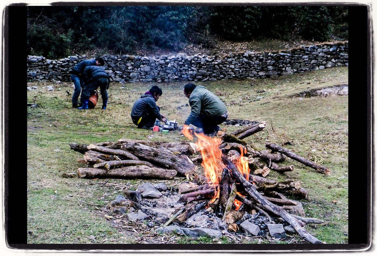 多少の上り下りはあるが、ここからあとは川からつかず離れずのフラットなトレイルが続いた。霧に包まれた森が水墨画のようだ。いつものように馬たちは先に行ってしまい、ジャムソー、ドルジ、リンチェン、私の4人で歩いた。水墨画状態の草原でお茶休憩。さらに進むと道は上り坂になり、小さな峠を越えた。峠の向こうに視界が開け、ずっと遠くに四角い石英のカケラをばら撒いたような集落が見えた。サクテンの村だ。