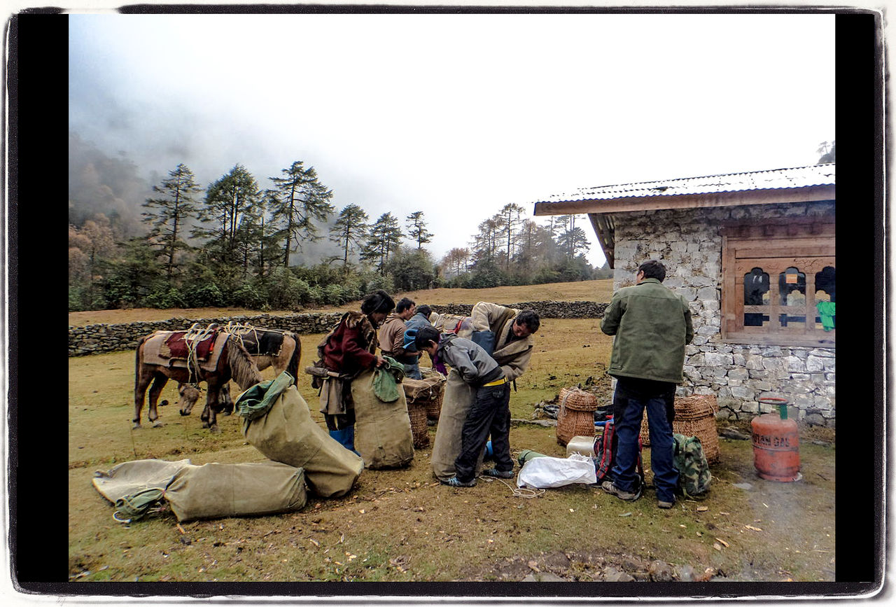 翌朝、相変わらず霧が深かったが、雨は上がっていた。雨中の撤収にならなくてよかった。今日の歩行距離は昨日と同じくらいだが、標高差はあまりない。ゆっくり出発して大丈夫だ。朝食のあと装備をパッキングして馬につける。ドルジの父親は飛び入り参加なのに、まるで最初からトレッキングのメンバーだったかのように、鮮やかな手つきで手伝っていた。ロブザンもそうだが、無駄のない動きで、重たい荷物をあっという間に馬の背に括りつける。
