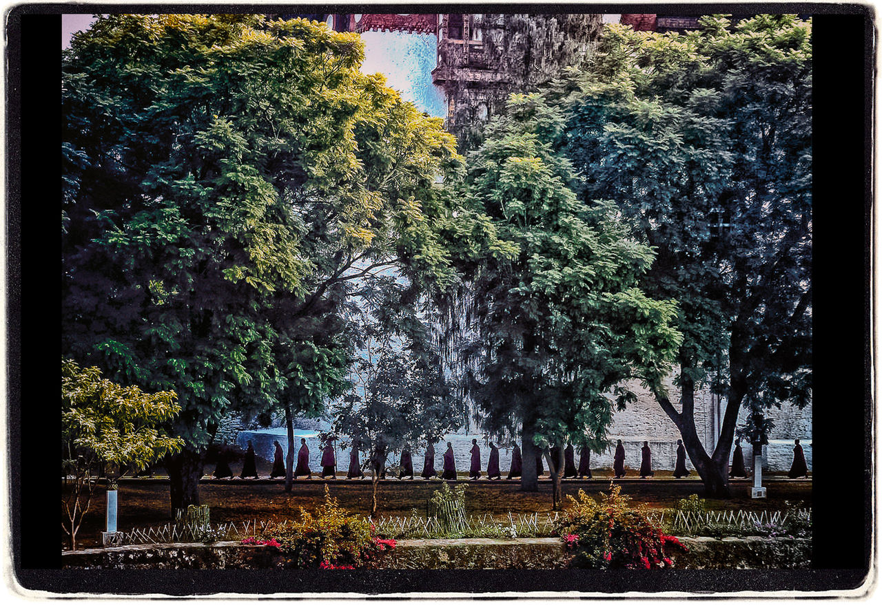 トロンサのゾンも魅力的な場所だったけど、プナカのゾンはさらに大きく、中もきっときれいだろう。そうこうしているうち9時になり、その時刻から儀式が始まるのか、たくさんの僧侶が一列になりゾンの建物から出てくるのが見えた。角笛が鳴り、鉦が打ち鳴らされる。僧侶の列は遠く、ゾンの背後の草原へと続いていった。