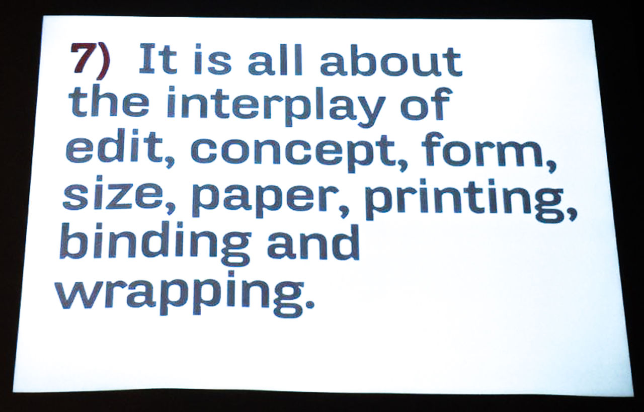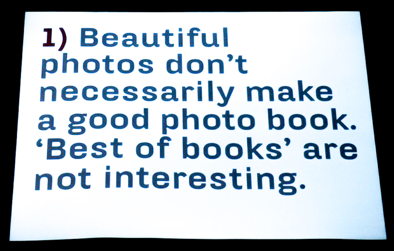 ◆ 講義は、同スペースで実施中のワークショップ『RPS PHOTOBOOK MASTERCLASS』のスピンオフとして行われ、両氏がこれまで手がけた写真集を材に、トゥーン・ファン・デル・ハイデン氏(以下、トゥーン氏)が自身のノートから抜き出した12のメモを用いて、写真集デザインの《核》となる要素をレクチャーをするというものだった。