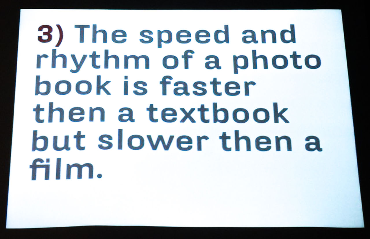 ◆ 『本の速度とリズム』。講義はそんなふうに銘打たれていたが、実際には《核》となる12のメモや各写真集をめぐるエピソードを通して、単なるテクニカルな解説を超えたもっと本質的な事柄に対するトゥーン氏の考察が語られており、その部分がとりわけ強く印象に残るものだった。