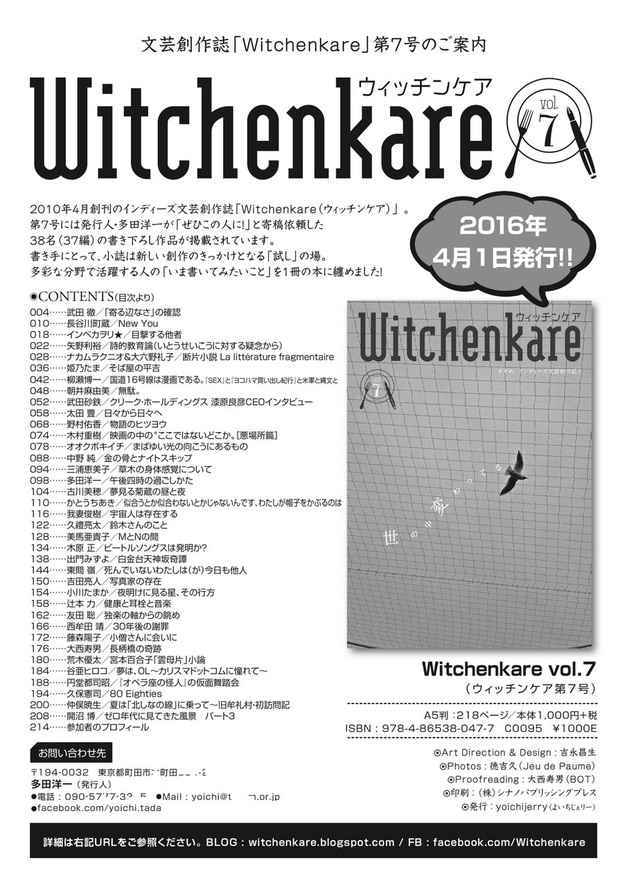 2016年4月1日発行の【Witchenkare(ウィッチンケア)第7号】に、エン-ソフから東間嶺《死んでいないわたしは(が)今日も他人》(p144)、と荒木優太《宮本百合子「雲母片」小論》(p180)の寄稿作が掲載されています。詳細は下掲の宣材チラシおよび公式ブログの【告知】と【つかみ】を御覧ください。東間は5号から三回目、荒木は6号から二回目の寄稿になります。