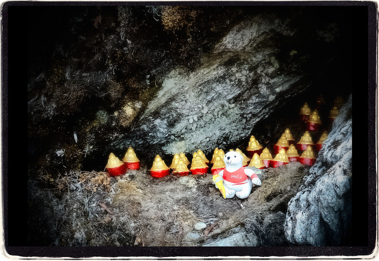 そのかわり、岩の隙間にツェツェがたくさん置かれているのを見つけた。ツェツェとは、中にお経を印刷した小さな紙が入っている素焼きのいれものだ。ブータンの人はこれを寺院のプレイヤーホイールの周りやチョルテンの周りに奉納する。自動車道路からさらにトレイルを歩かないとたどり着けないこんな所に、誰が何のためにツェツェを置いたのだろう。
