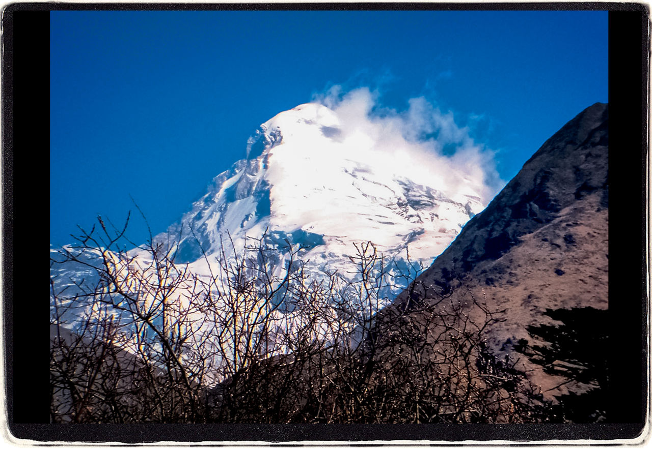 前日、予定より手前の地点でキャンプしてしまったので、トレッキング2日目はそのぶん歩く距離が長かった。でも峠越えなどの急な上り坂はなく、天気もよくて、きれいな景色を眺めながら楽しくその道のりを歩いた。出発してしばらくすると、雪をかぶったジョモラリ山の美しい姿が遠くに見えた。今日のキャンプ地はあの山のふもとだ。