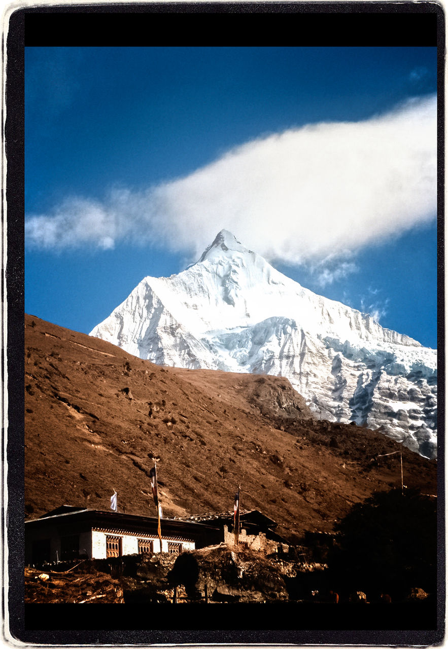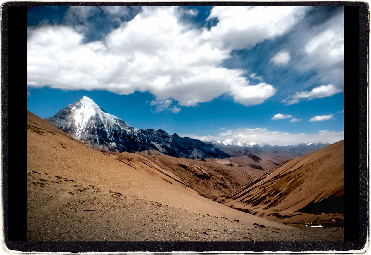 ニレラの峠は標高4,890メートル。空気が薄い上に峠へのアプローチは崩れやすい小石の急坂で、ごくゆっくりでないと歩けない。でも私も、他のトレッカーたちに混ざって元気に峠へたどり着いた。ジョモラリは見えなくなり、代わりにツリマ山が見えてきた。ここから峠の反対側へ、崩れやすい急坂を下る。