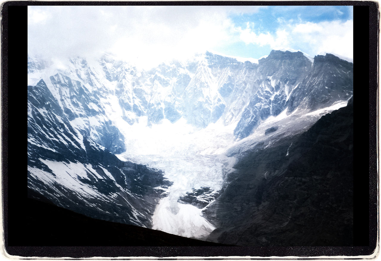 いつものように、午後遅い時間になると空に雲が多くなってきた。トレイルはフラットになり歩きやすいけれど、歩行距離は長かった。やがてツリマの下に氷河が広がっているのが見えてきた。歩くのもいいかげん飽きた頃、視界のずっと下に、先回りしたマイラとチュンクーが張った赤いテントが見えた。この日のキャンプ地は、ツリマの氷河を水源にする小さな川のほとりだった。