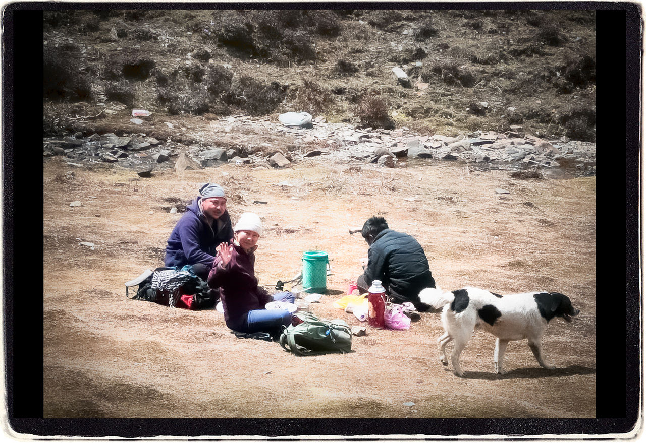 坂を下り、万年雪から流れ出た水が小さな川になっている所で昼食になった。ドルジがバックパックから保温容器を取り出し、みんなで弁当を食べた。ジャンゴタングで知り合ったスイス人のトレッカーが通りかかり、私たちの写真を撮ってくれた。トレッキングのグループはこれが最後で、そのあとはもう誰も来なかった。私たちは朝一番早く出発したのに最後尾になってしまった。でもそんなふうに、のろのろだらだら過ごすのがとても贅沢なことに思え、楽しかった。