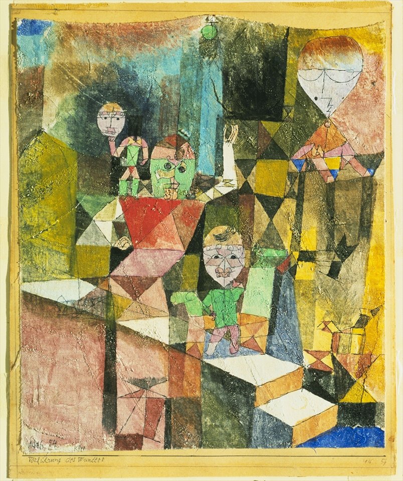 クレーについては、先の講演とはまた違ったふうにも言えるだろう。たとえばこんなふうに。彼はあらゆる対象のなかで、ごく小じんまりと、戯れるようにふるまう。巨大なものの時代にあって、緑の葉一枚、小さな星ひとつ、蝶の羽根ひとつに惚れこむ。そのなかにも天空と一切の無限が映し出されるので、彼らはそれらをも共に描きこんでいく。彼が使う先の細い画筆に誘われて、小さい細やかな世界が形づくられる。彼はいつも最初の発端のごく近くにとどまっている、だから絵のサイズはいつも小さい。発端が彼の心を支配して、離れないのだ。末端までたどりついてしまうと、すぐには新しい絵にとりかからないで、最初の絵を彩色し始める。小さなサイズの絵がひきしまった強さでいっぱいになり、魅惑的な手紙となり、彩色による重ね描きの透視画となる。
