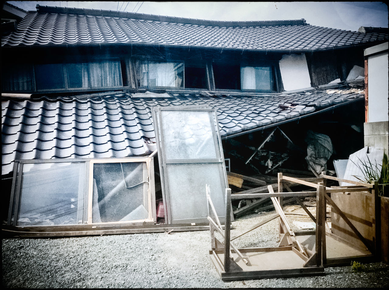 向いのお宅は外壁の大半が崩れ落ち、ほぼ丸裸の骨組みだけの状態で、しかも一目見て分かる程に大きく左に傾いていた。勿論住める筈もなく、門には危険を知らせる赤紙が貼ってあった。この家は、恐らく二階を移動しただけでシーソーのように揺れるだろう。