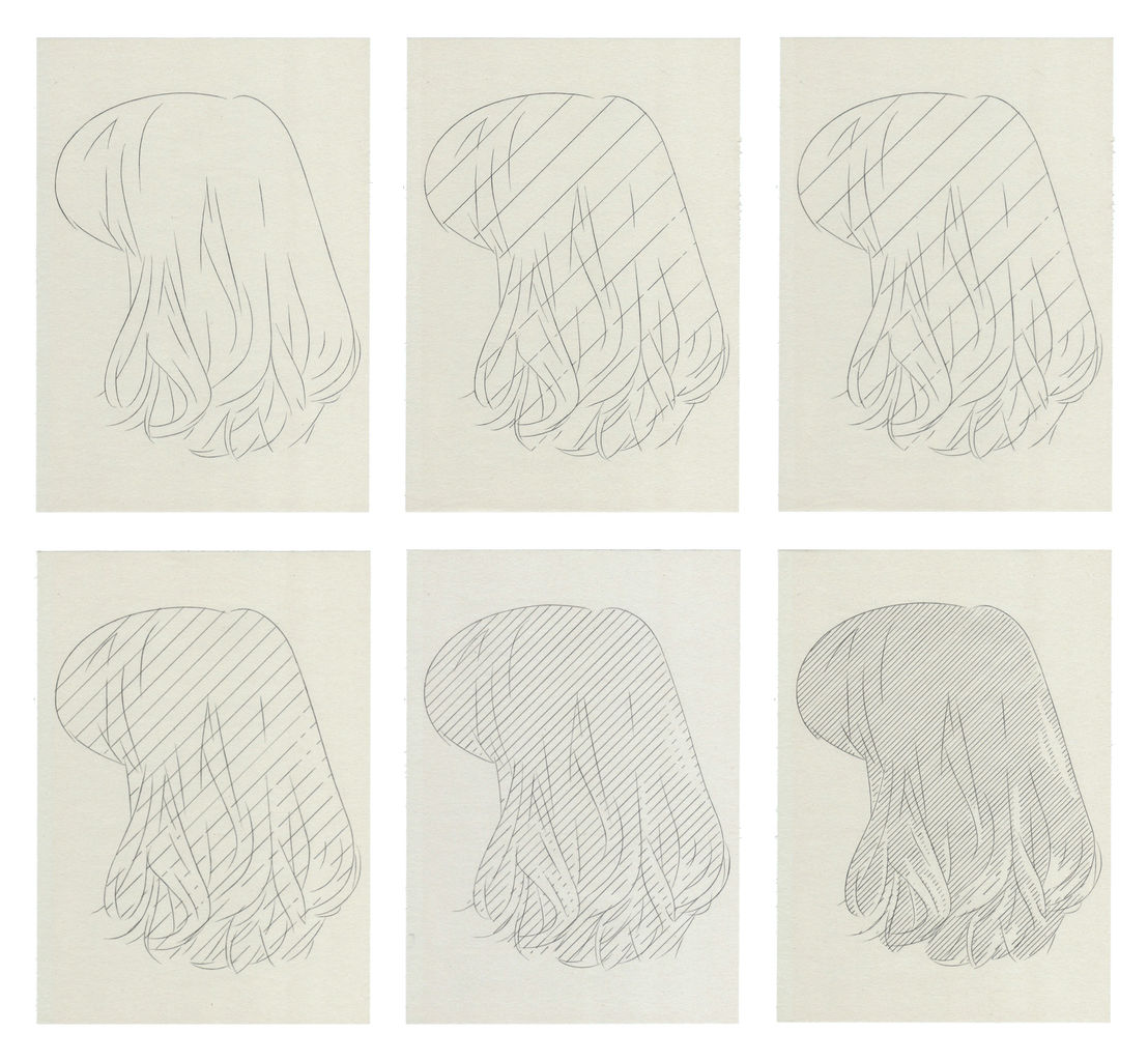 ヘアカタログ掲載のモデルを忠実に写すこと、すなわちレファレンスを制作の原理とすること、それから、カラーを斜線に置換して図像に無機質で均質なレイヤーを被せること。こうしたルール設定は「自由な」描写を拘束し、描き手の個性、手癖、創意といったものを、限りなく零度に近づける。個性をよしとする芸術家の制作物というよりは、同一モデルの大量生産に無私で取り組む職人の仕事に似ているかもしれない。work/productのあわいに位置する不可思議な様態。